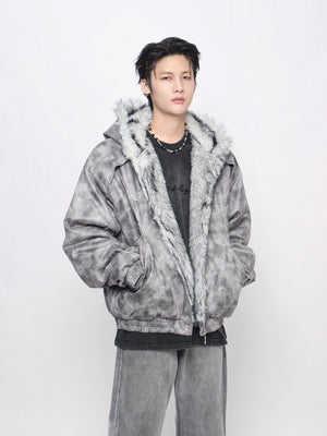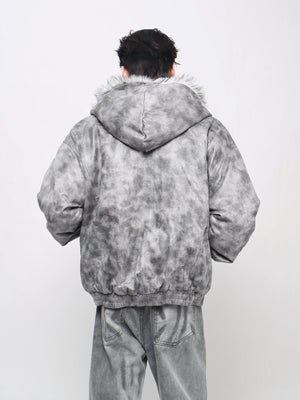 Heavy design high street dirty dye do old mountain carving cotton clothes men's American niche fur collar hooded loose coat