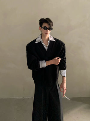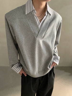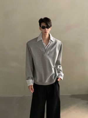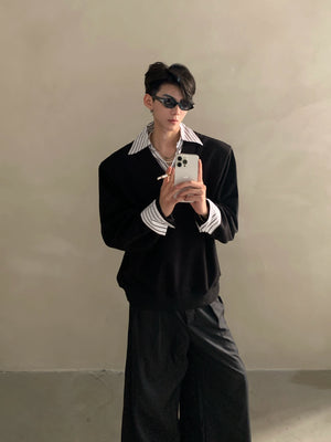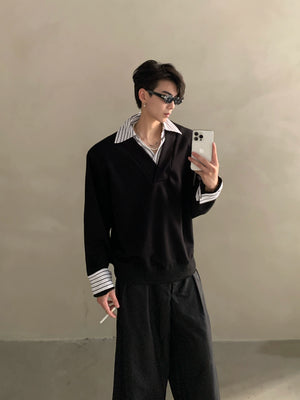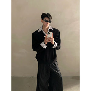 Niche design sense fake two-piece splicing sweater men's high-end sense ruffian handsome shirt collar long-sleeved top