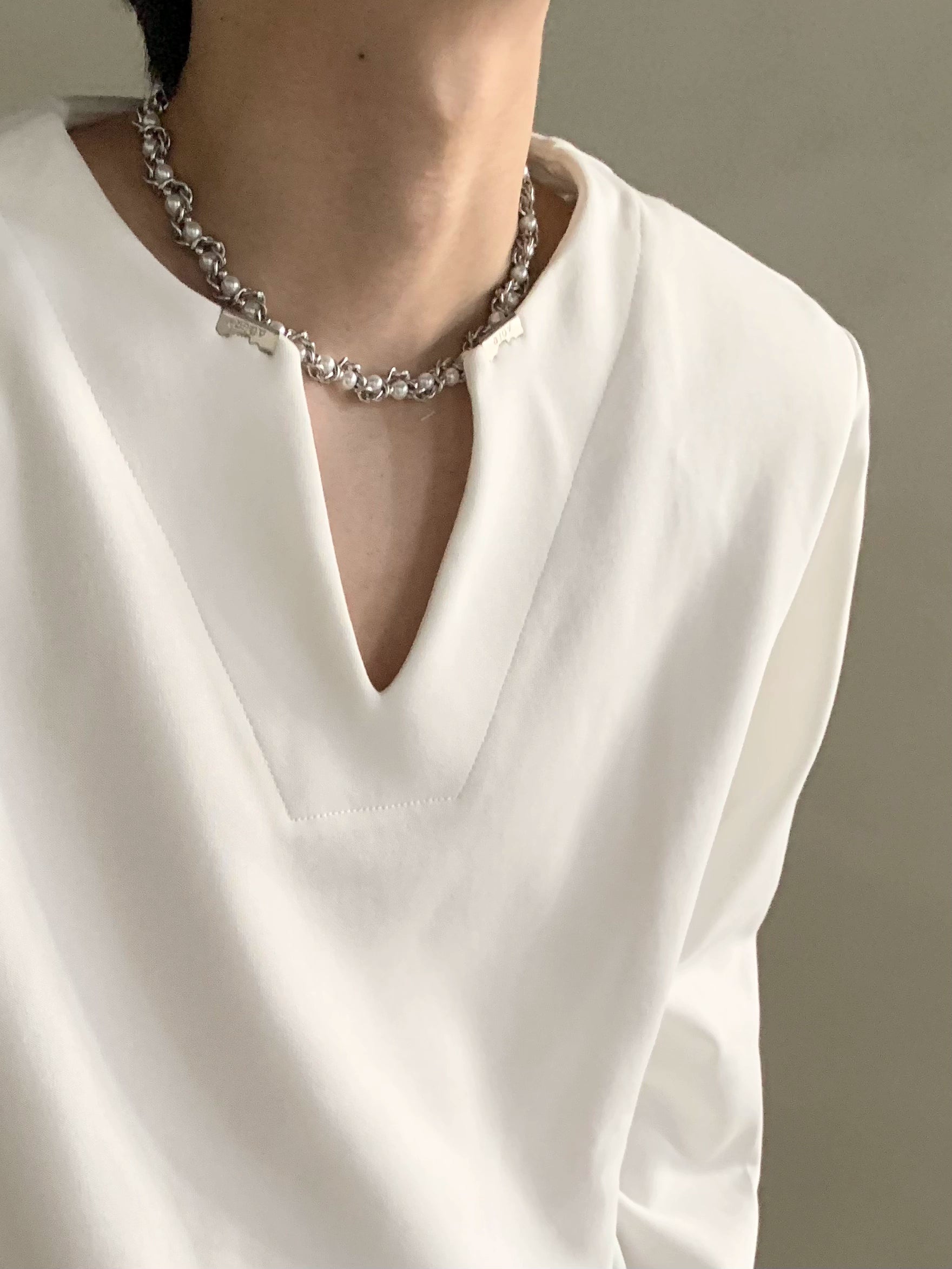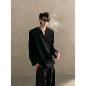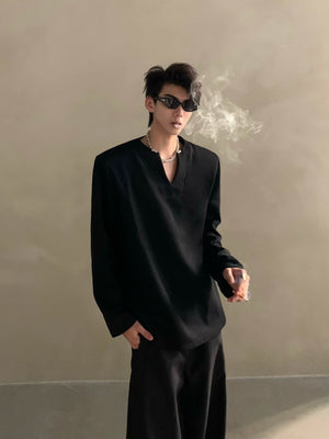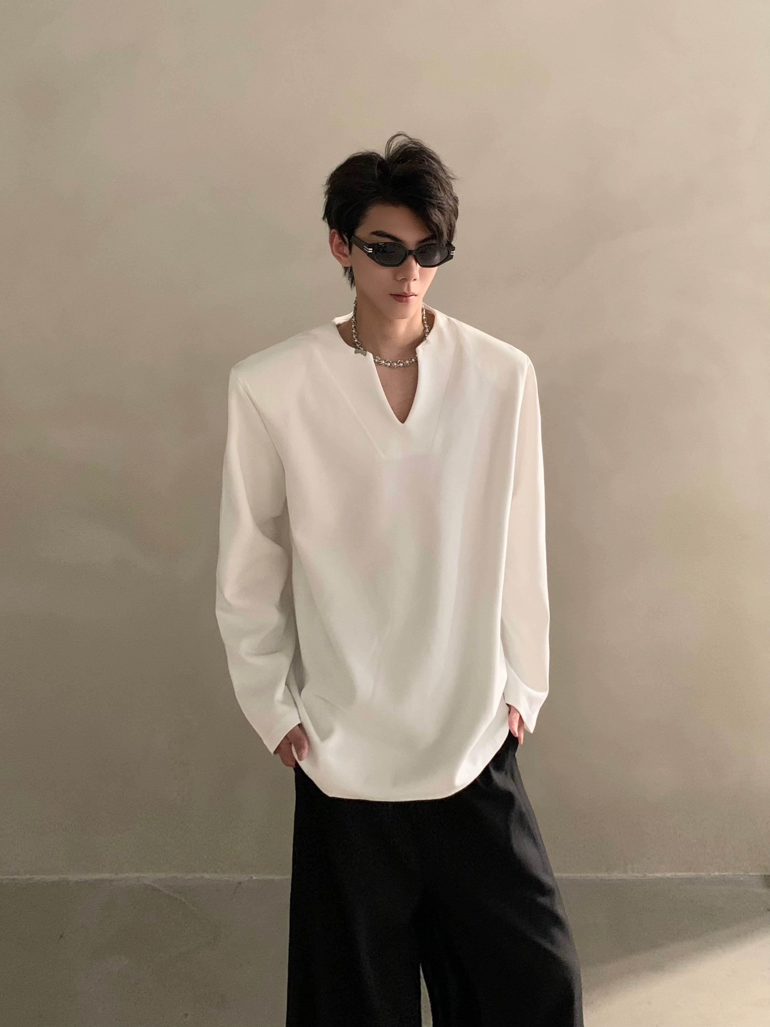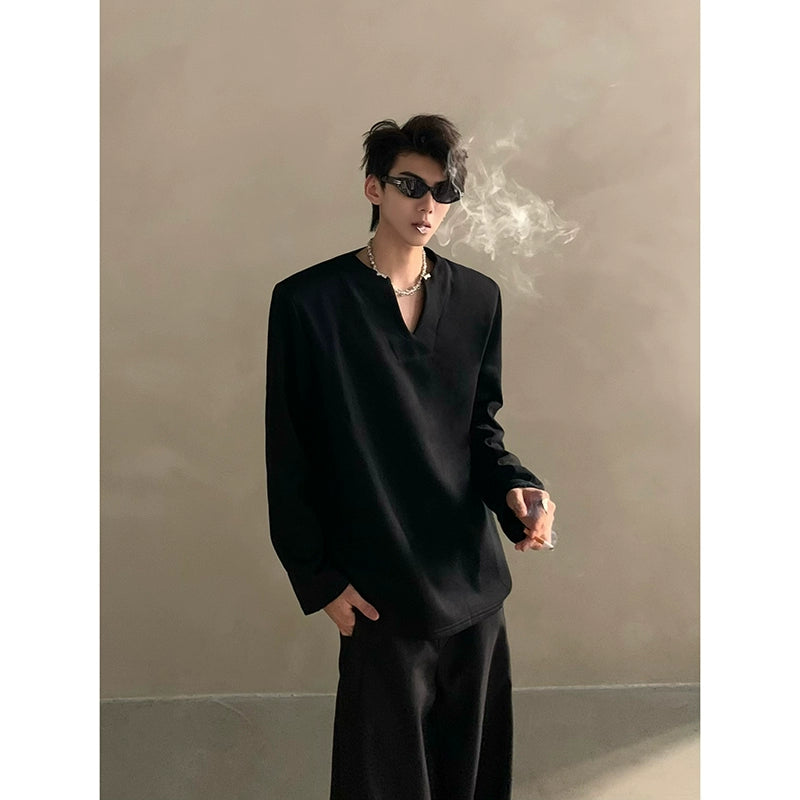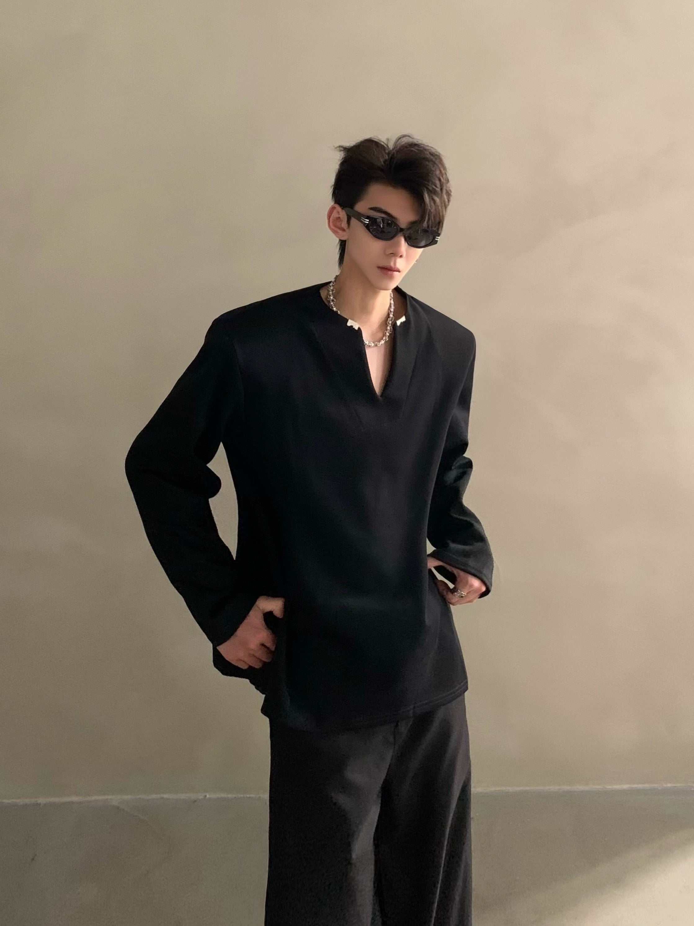 Autumn high-end V-neck metal decorative shoulder pads long-sleeved T-shirt men's ruffian handsome loose top