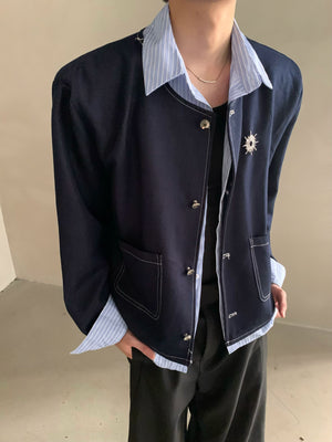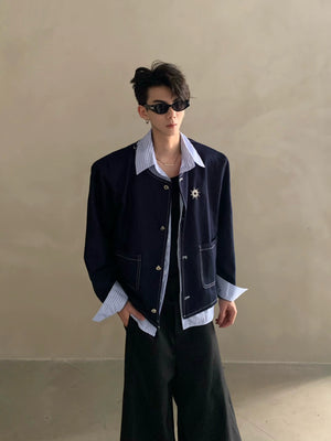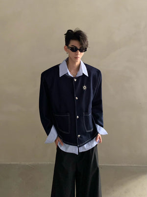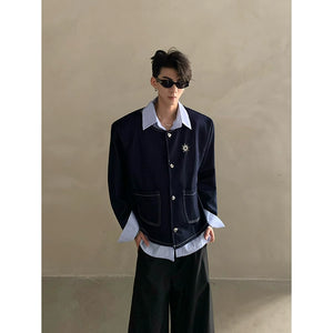 Autumn light luxury high-end fake two-piece splicing design shirt male ruffian handsome shoulder padded jacket jacket