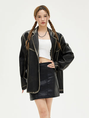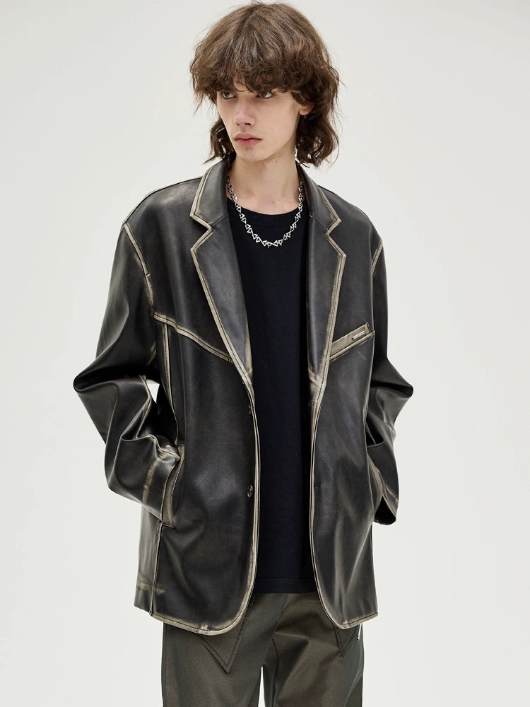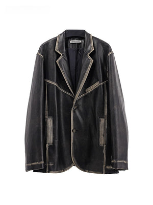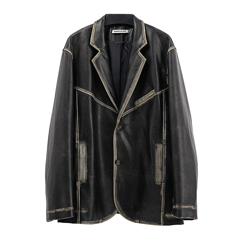 American retro polished leather jacket suit for men and women, black trendy jacket