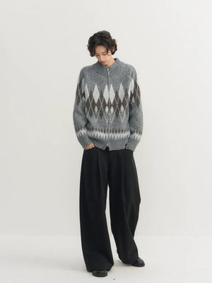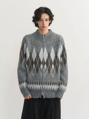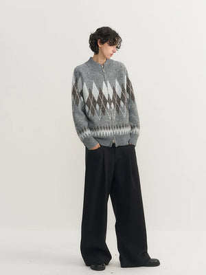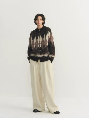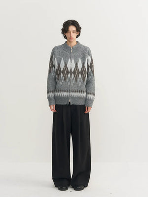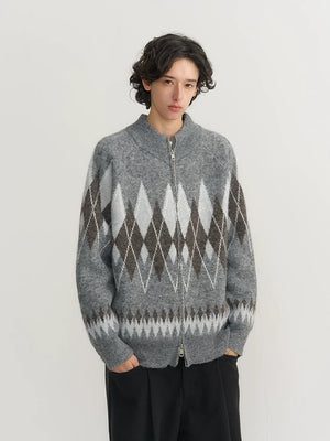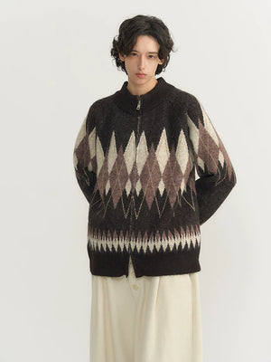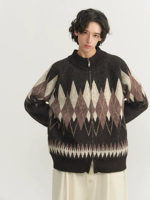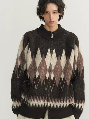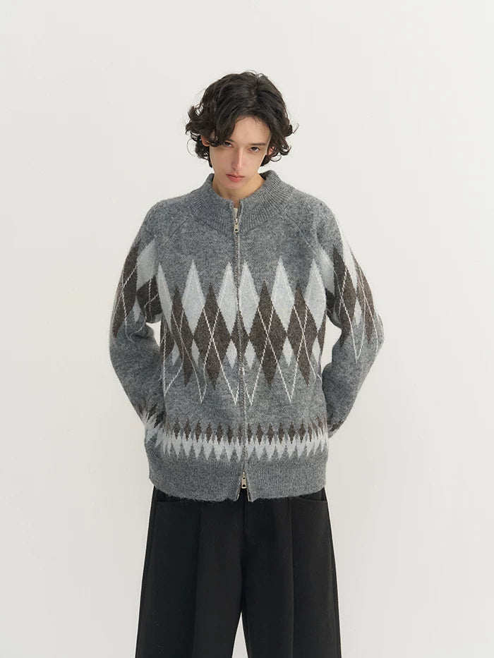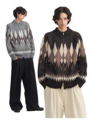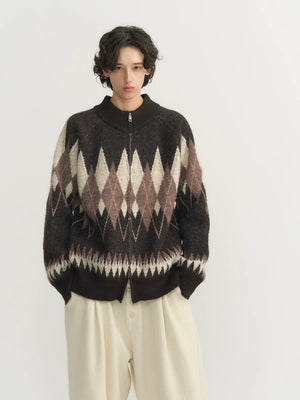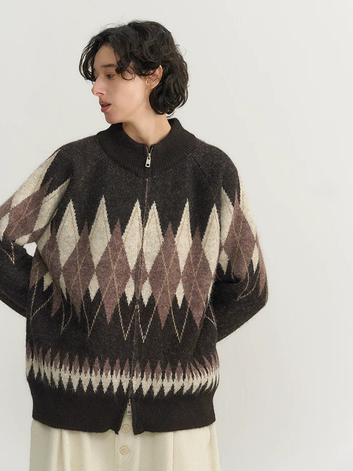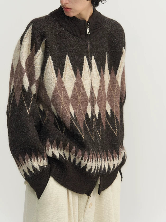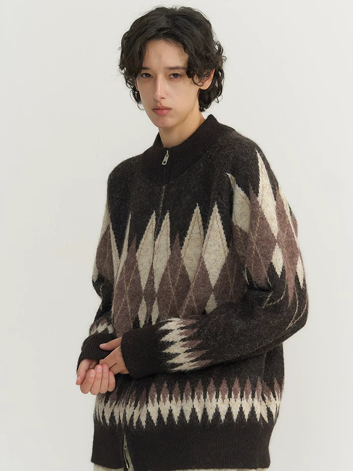 Alpaca long hair diamond quilted zip-up turtleneck fair isle sweater SIN0887