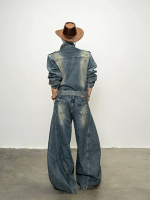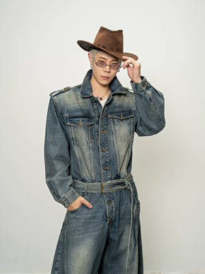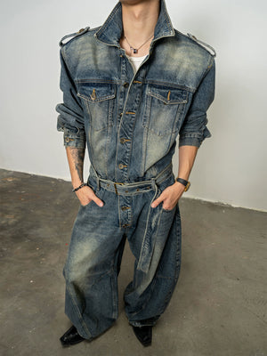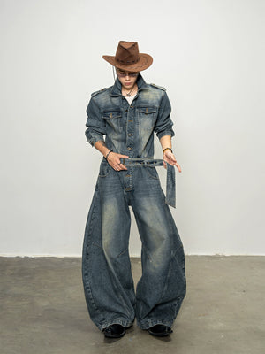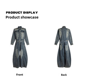 American classic resurgence, old washed shoulder padded denim onesie autumn loose scimitar pants