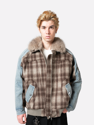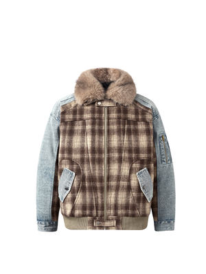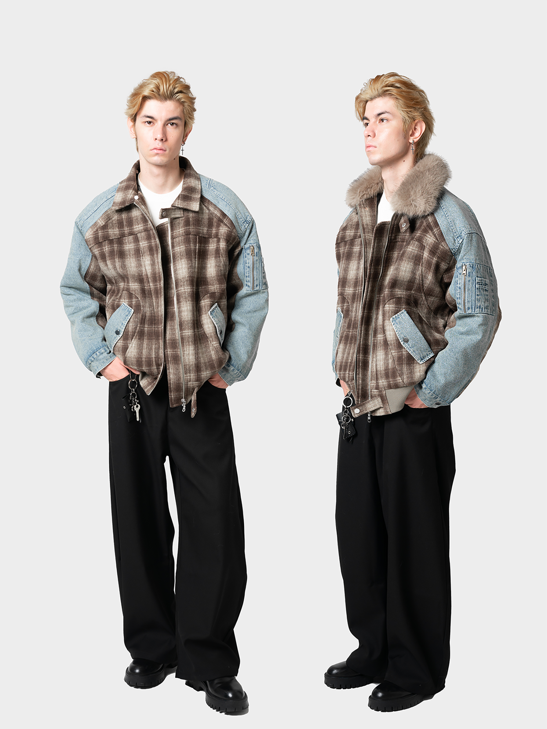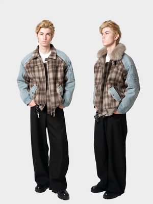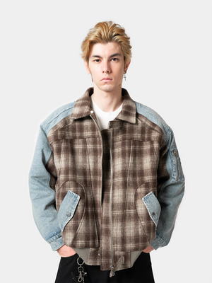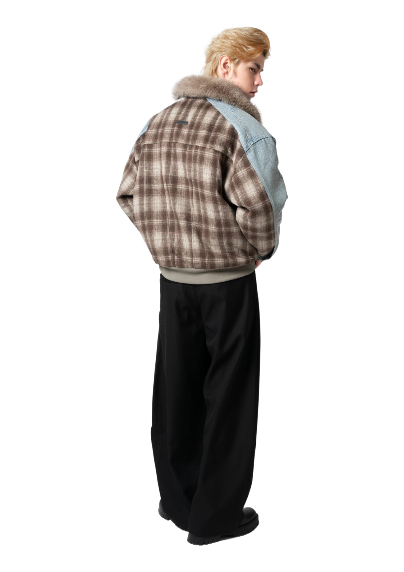 Heavyweight washed denim patchwork plaid wool blend padded jacket SIN0823