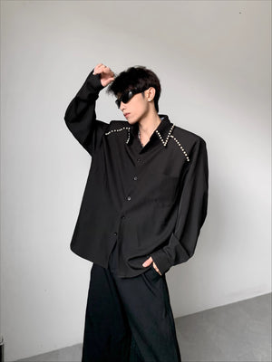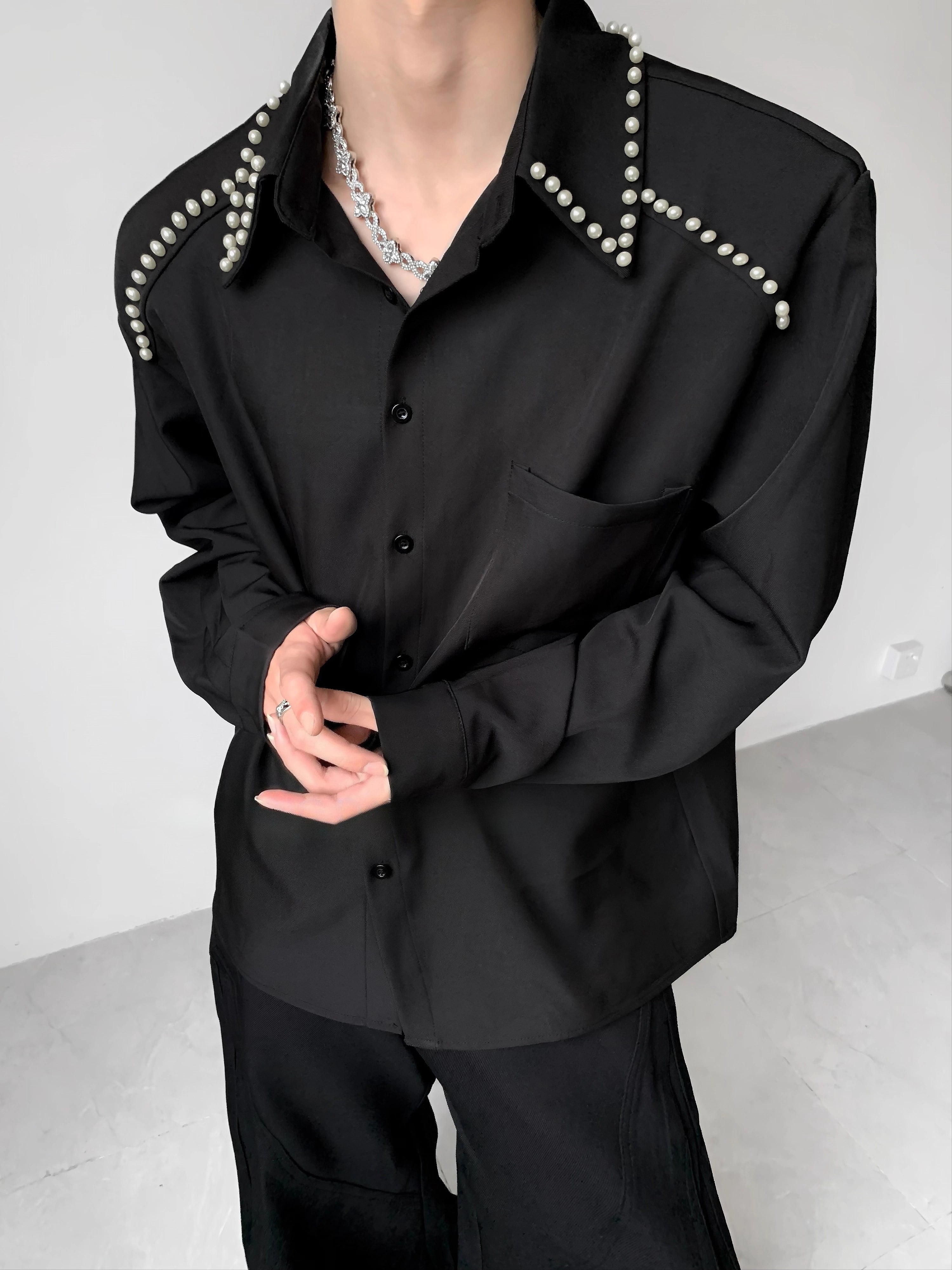 Light luxury pearl decorative design sense shoulder pad black shirt men's autumn high-end extravagant sense long-sleeved shirt
