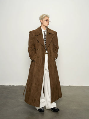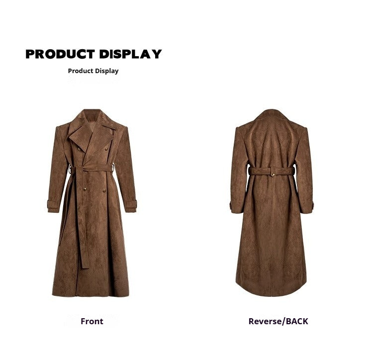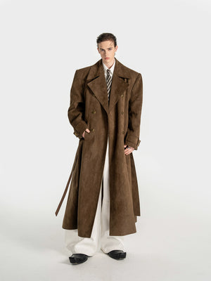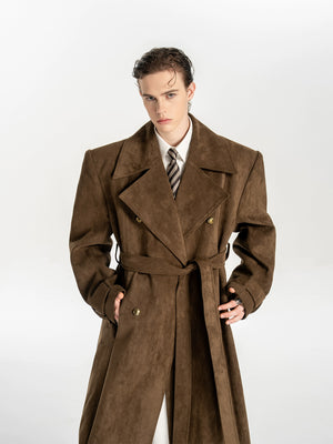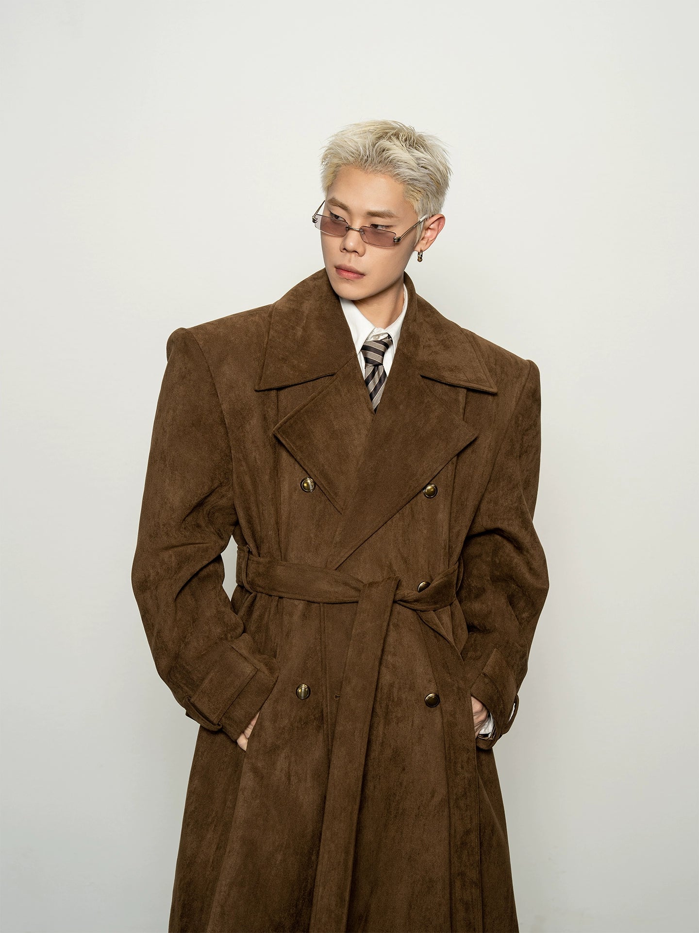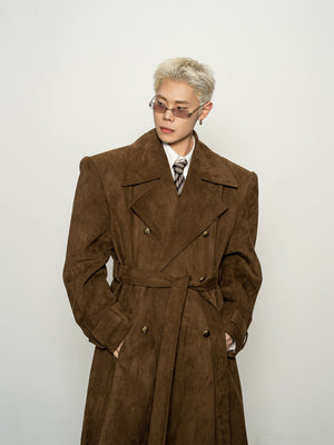 DBWDoublewin复古棕色麂皮直角宽肩长款气场大衣高级挺阔风衣外套