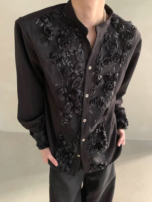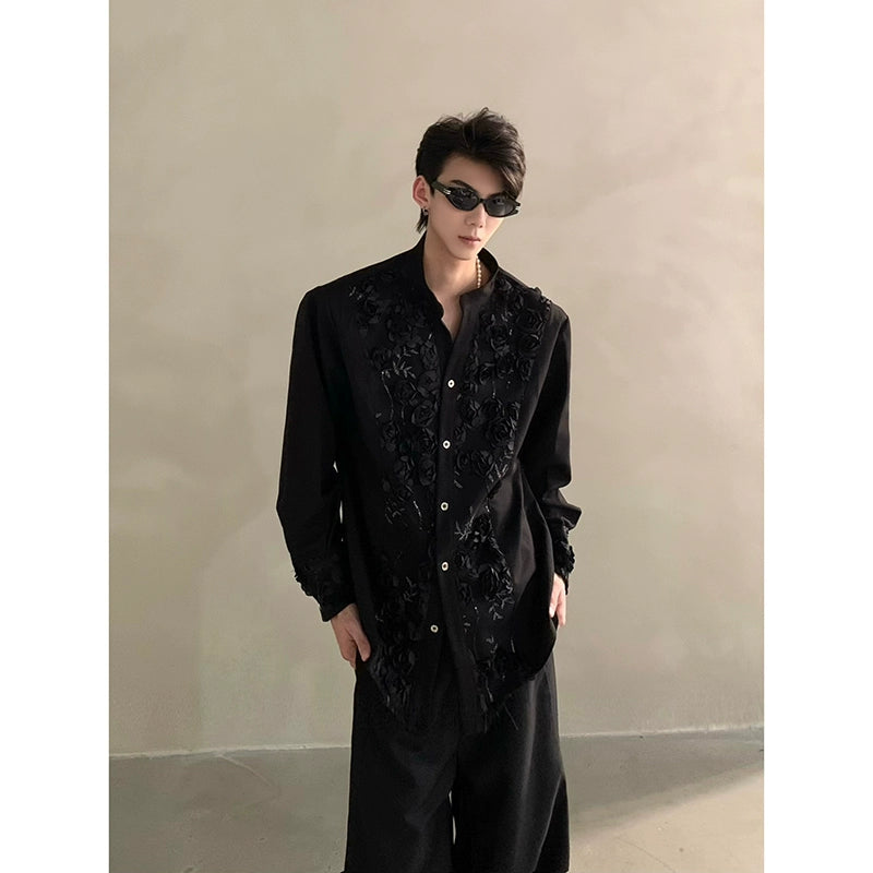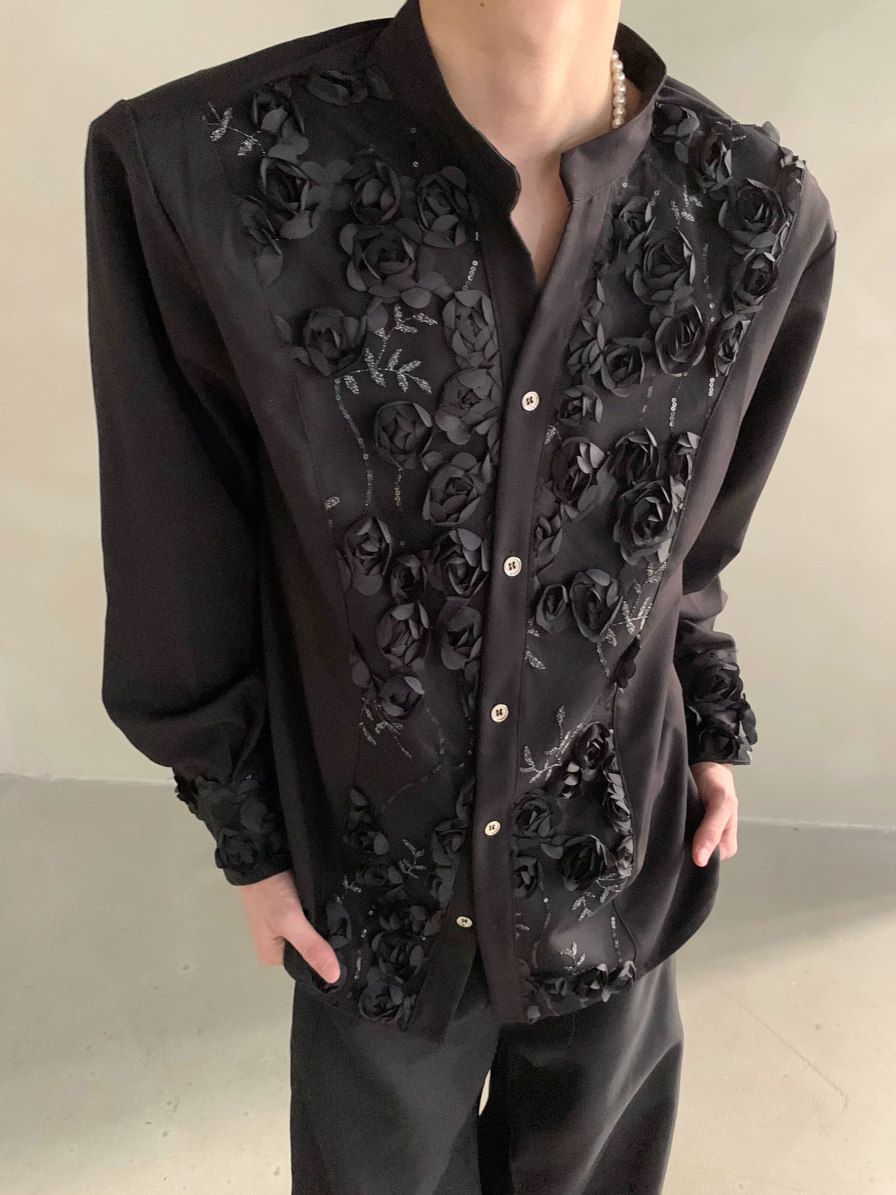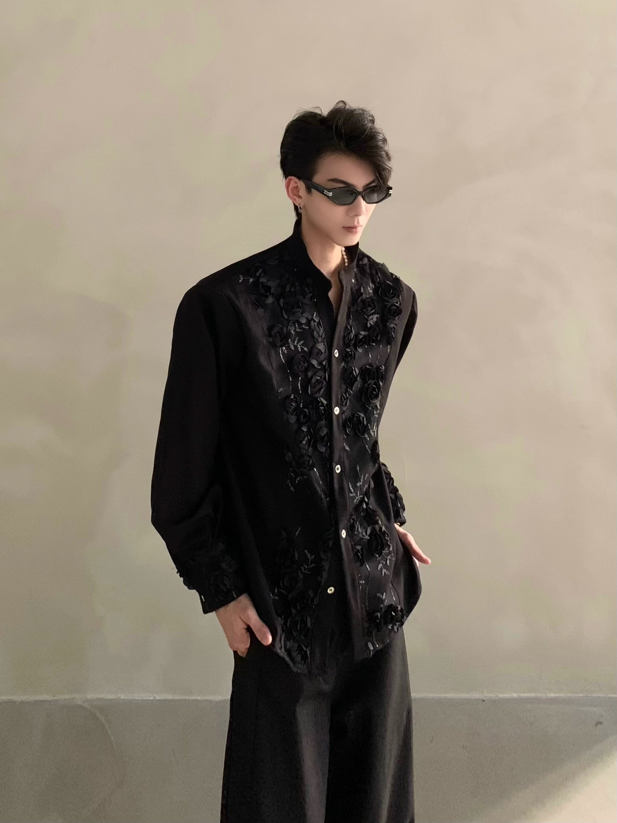 Light luxury niche high-end three-dimensional flower design black shoulder padded shirt men's ruffian handsome shirt tide